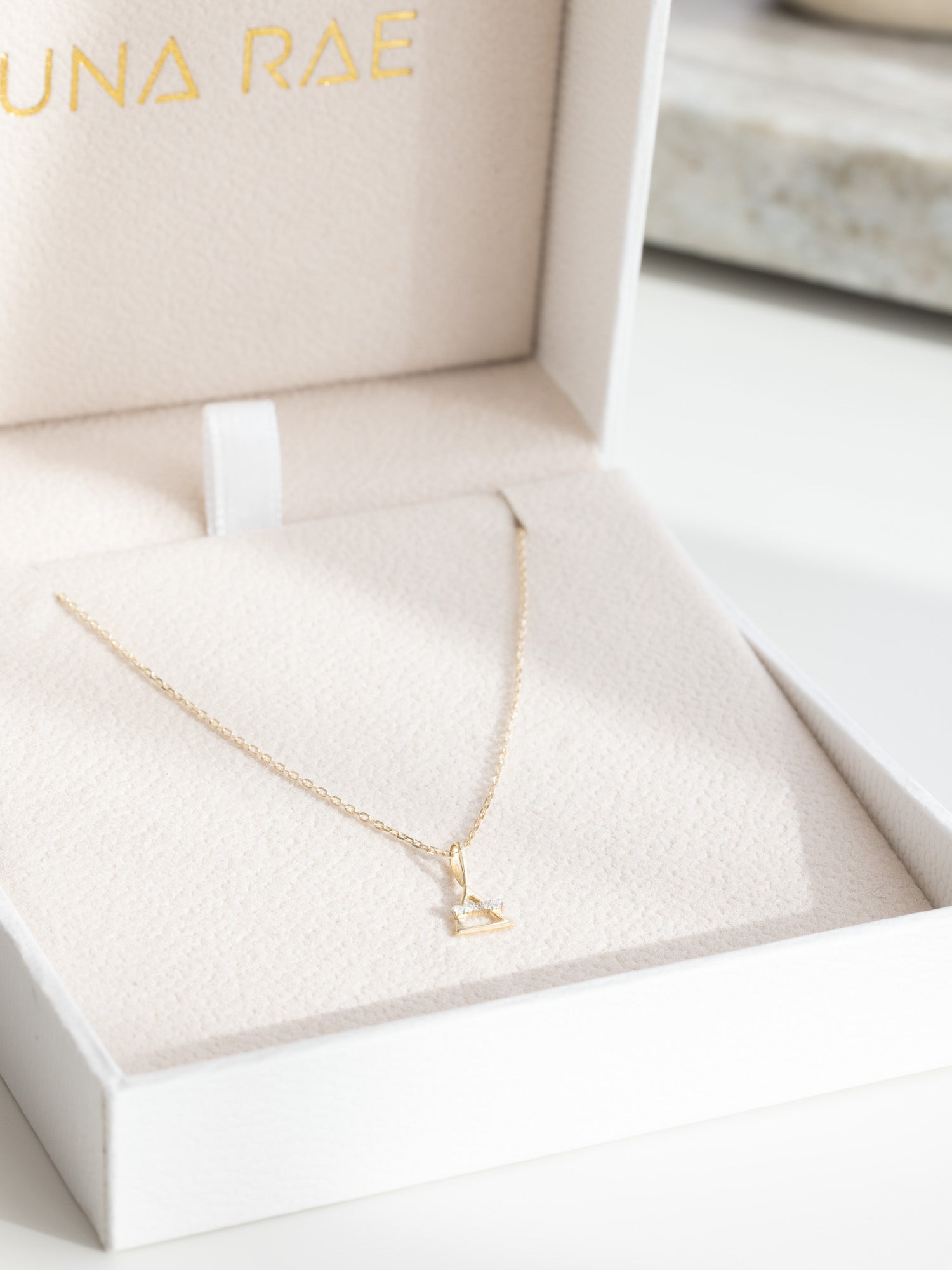 The necklace features an Air triangle charm in solid 9K gold that points upwards towards the sky, with a line of diamonds crossing through the middle, representing Air.