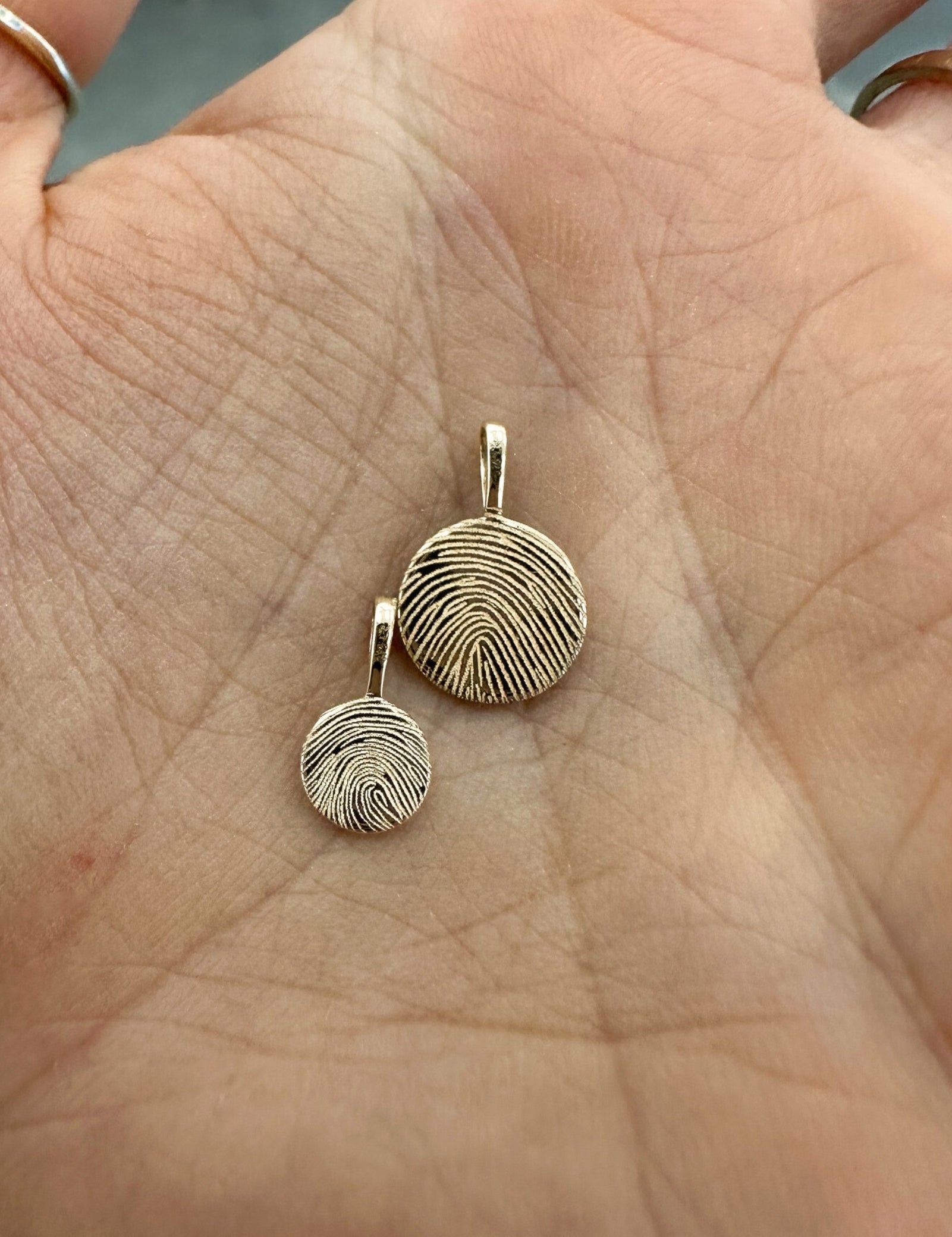 Note : All fingerprints are stretched across the pendant, leaving no border - this is our unique style which allows the prints to become the texture of the gold. Framing is only done on request and is not possible on all sizes.