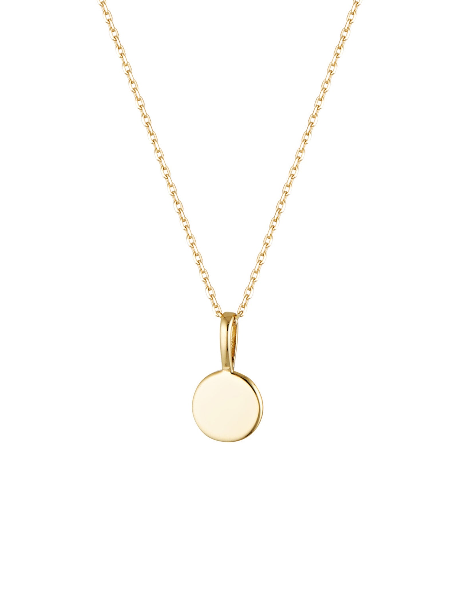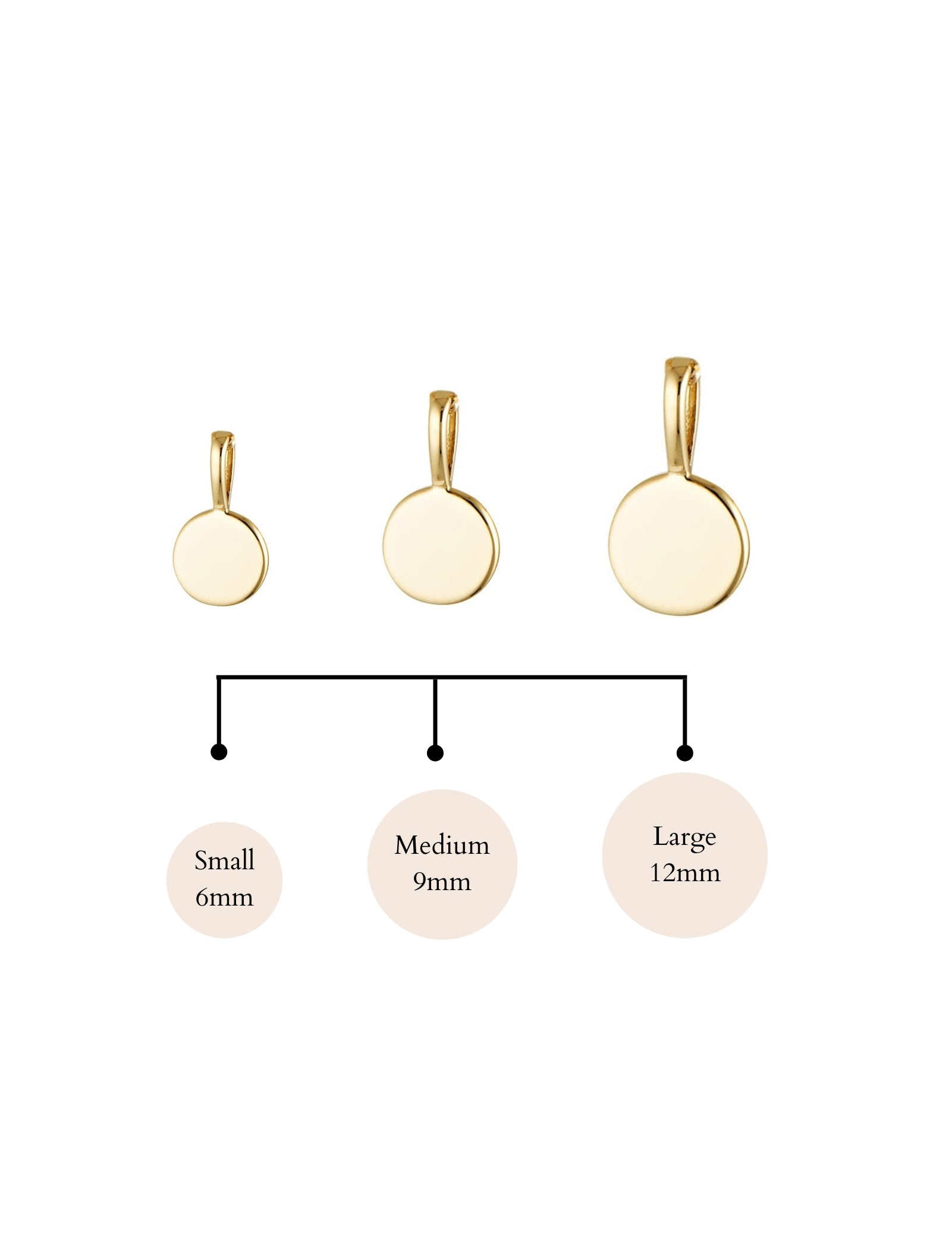 The Flat Disc Pendant comes in three sizes—Small (6 mm diameter, 0.8 mm thick, 4.7 mm bail height, 0.3 g), Medium (9 mm diameter, 0.8 mm thick, 4.7 mm bail height, 0.65 g), and Large (12 mm diameter, 0.8 mm thick, 4.7 mm bail height). Each size is lightweight and perfect for stacking, engraving, or wearing solo as a timeless, organic accent.