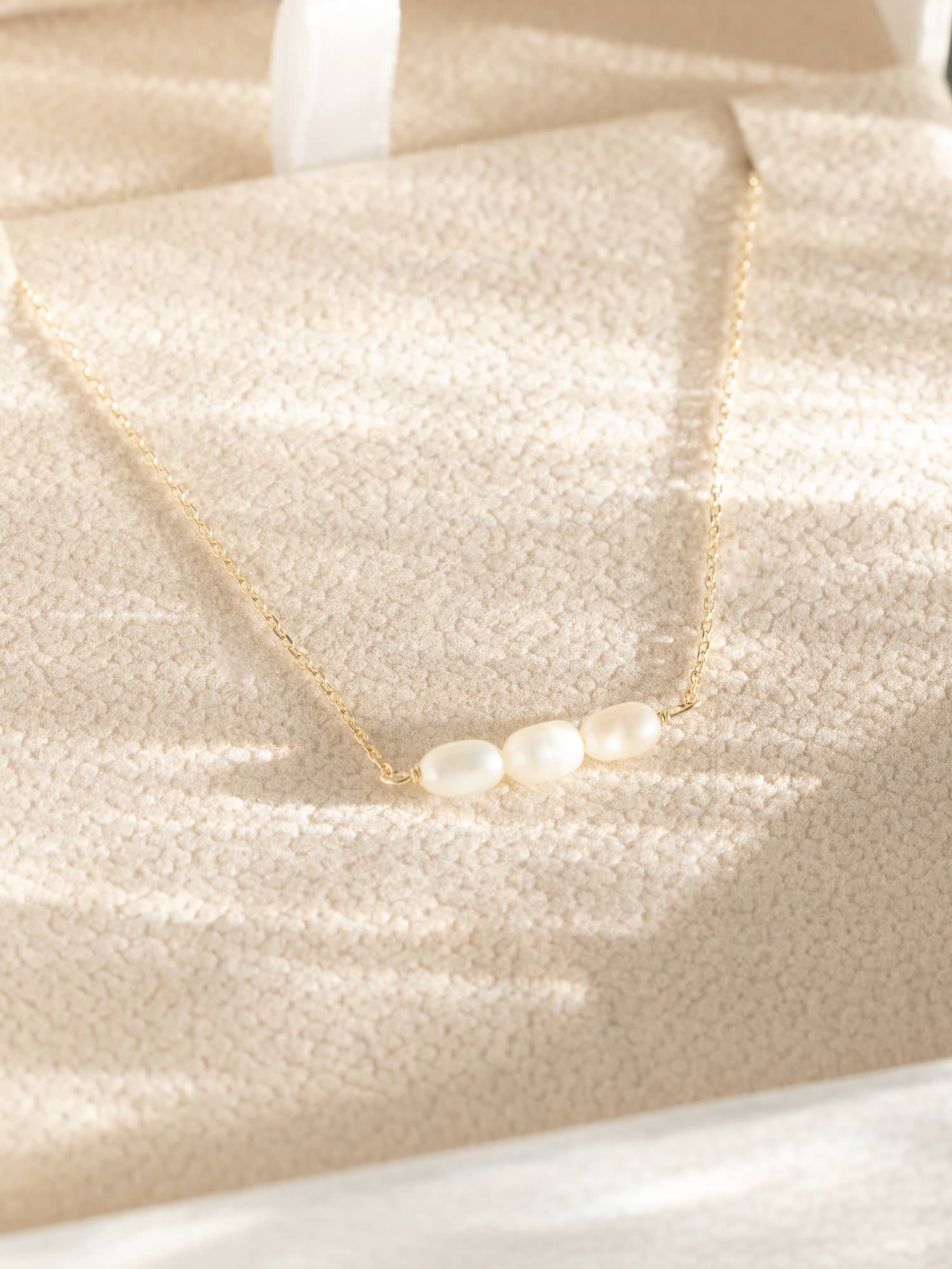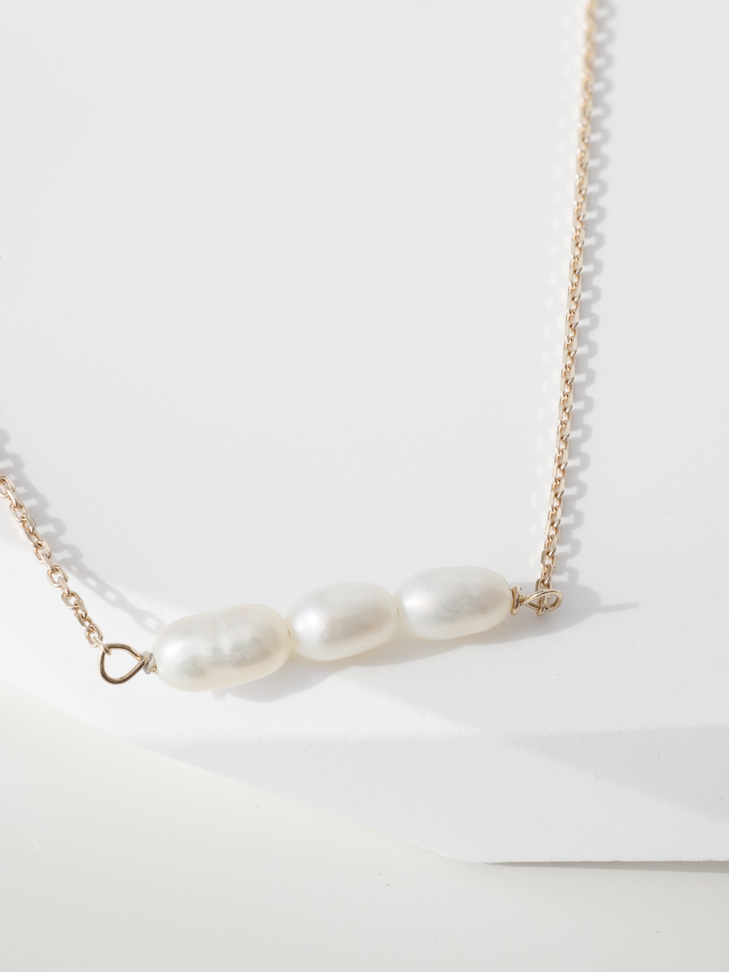 Elevate your style with the Margot Necklace, a piece that epitomises timeless elegance and sophistication. This exquisite necklace features a delicate chain crafted from 9k solid gold, beautifully adorned with three lustrous freshwater pearls. The pearls serve as the focal point, each capturing light in a way that complements the gold chain and adds a touch of luxury.