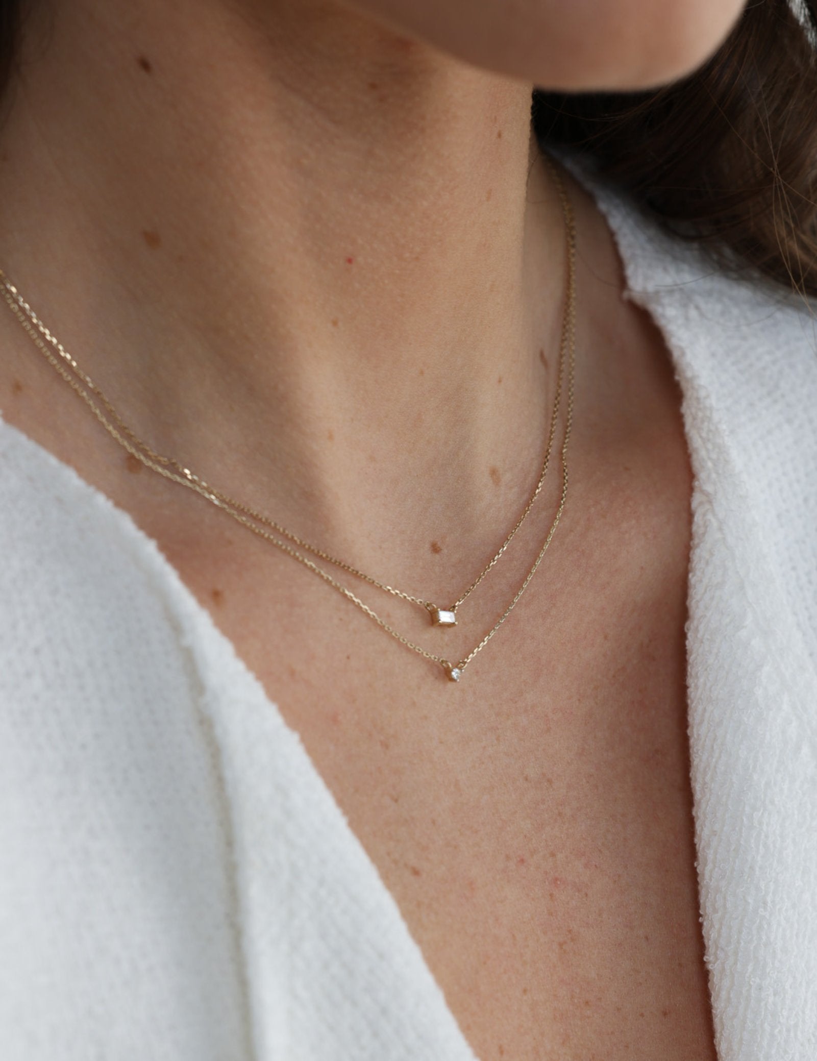 Discover the subtle elegance of the Petite Diamond Necklace. Featuring a beautifully cut triangular diamond, this necklace radiates sophistication with every angle. Crafted from solid 9K gold, this piece offers a sleek and modern touch to your look.