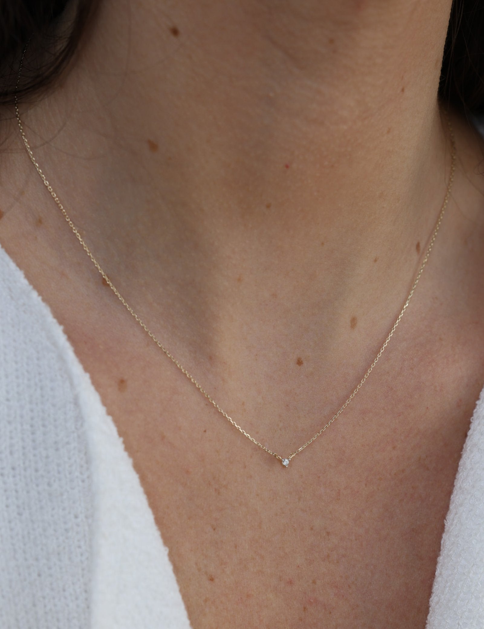 The Petite Diamond Necklace has a total gold weight of approximately 0.880 grams. The triangular cut diamond, measuring 1.70mm with a weight of 0.020 carats, is set in a 3-prong floating fixed setting. With a 40 cm length, this necklace provides a delicate touch of grace perfect for enhancing your daily style or adding a subtle sparkle to any occasion.