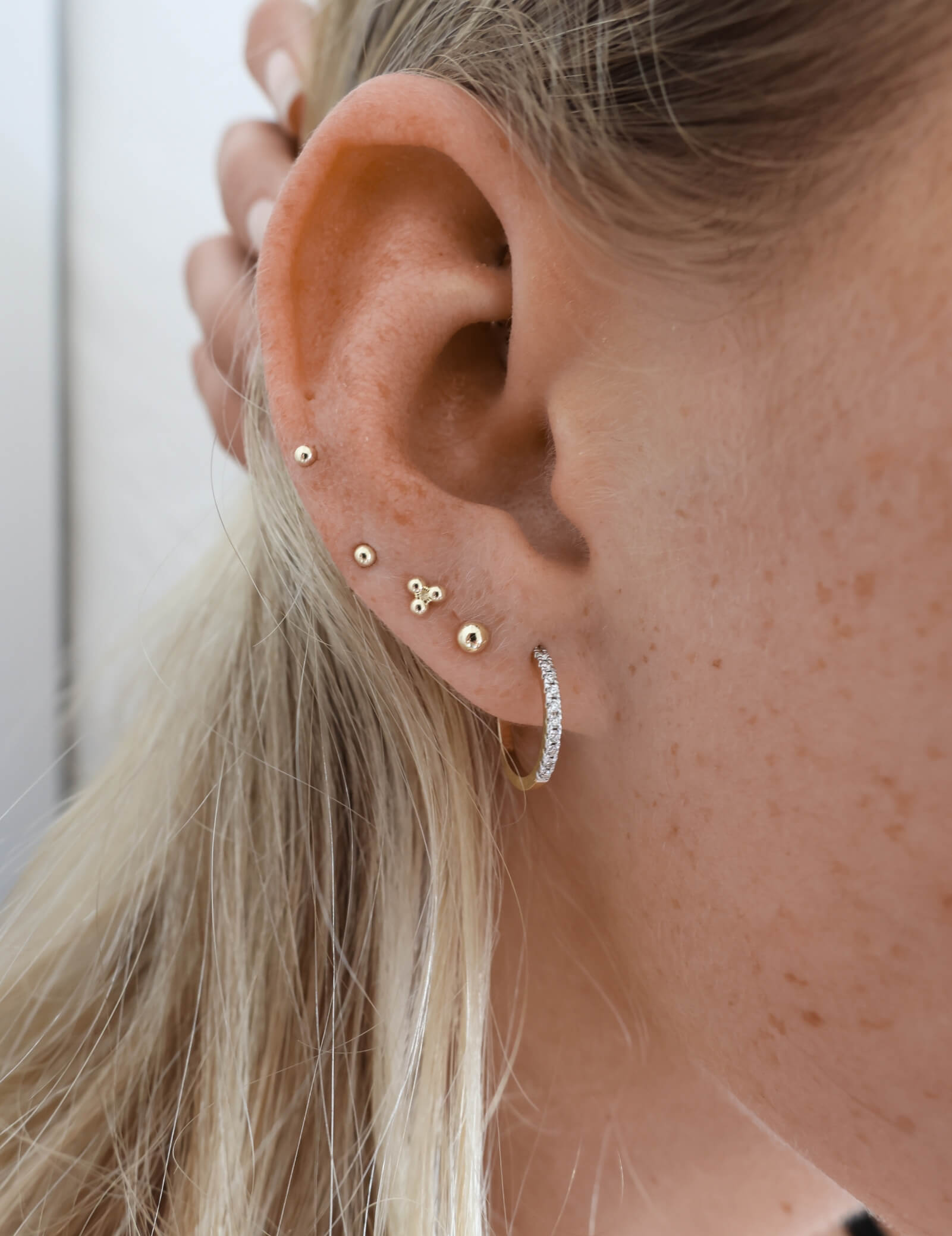 Petite Trio Studs feature a trio of 3 x 2mm gold balls 4mm each side, crafted in solid 9K gold with a total weight of 0.18g.