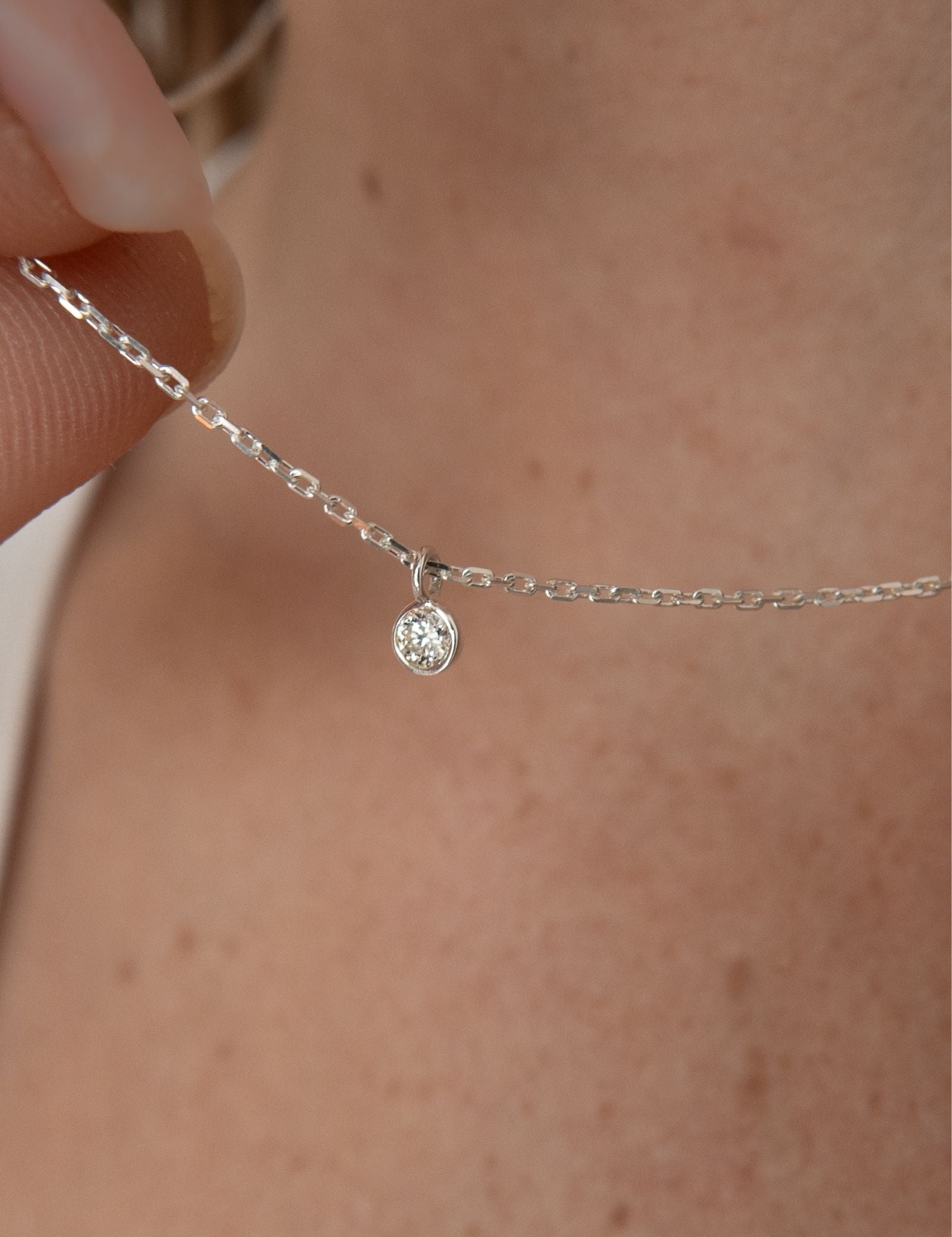 The Diamond Sky Necklace's pendant measures 3mm in diameter. The chain is 40cm with a 5cm extension, providing a balance of delicacy and substance.