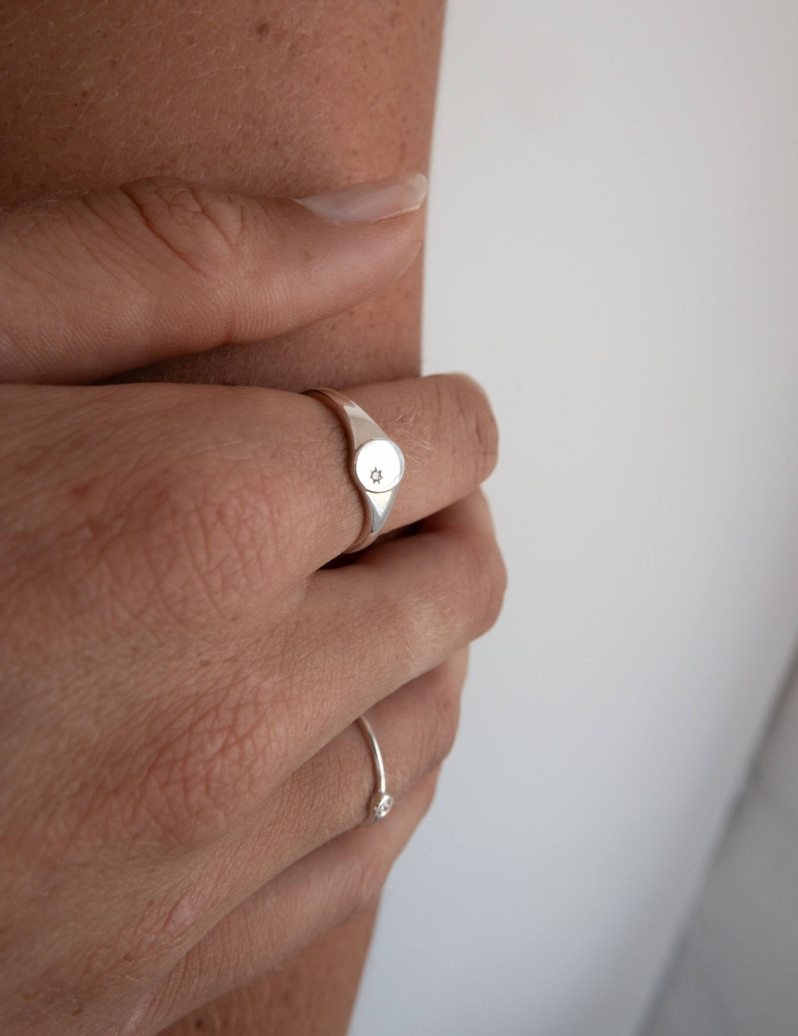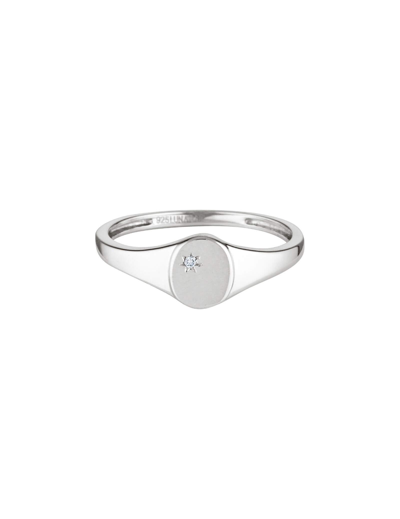 Discover the timeless allure of the Rhia Signet Ring. This sterling silver Signet embodies a refined sense of beauty, highlighted by a brilliant-cut white diamond at its heart. It captures the very essence of sophistication and subtle luxury.