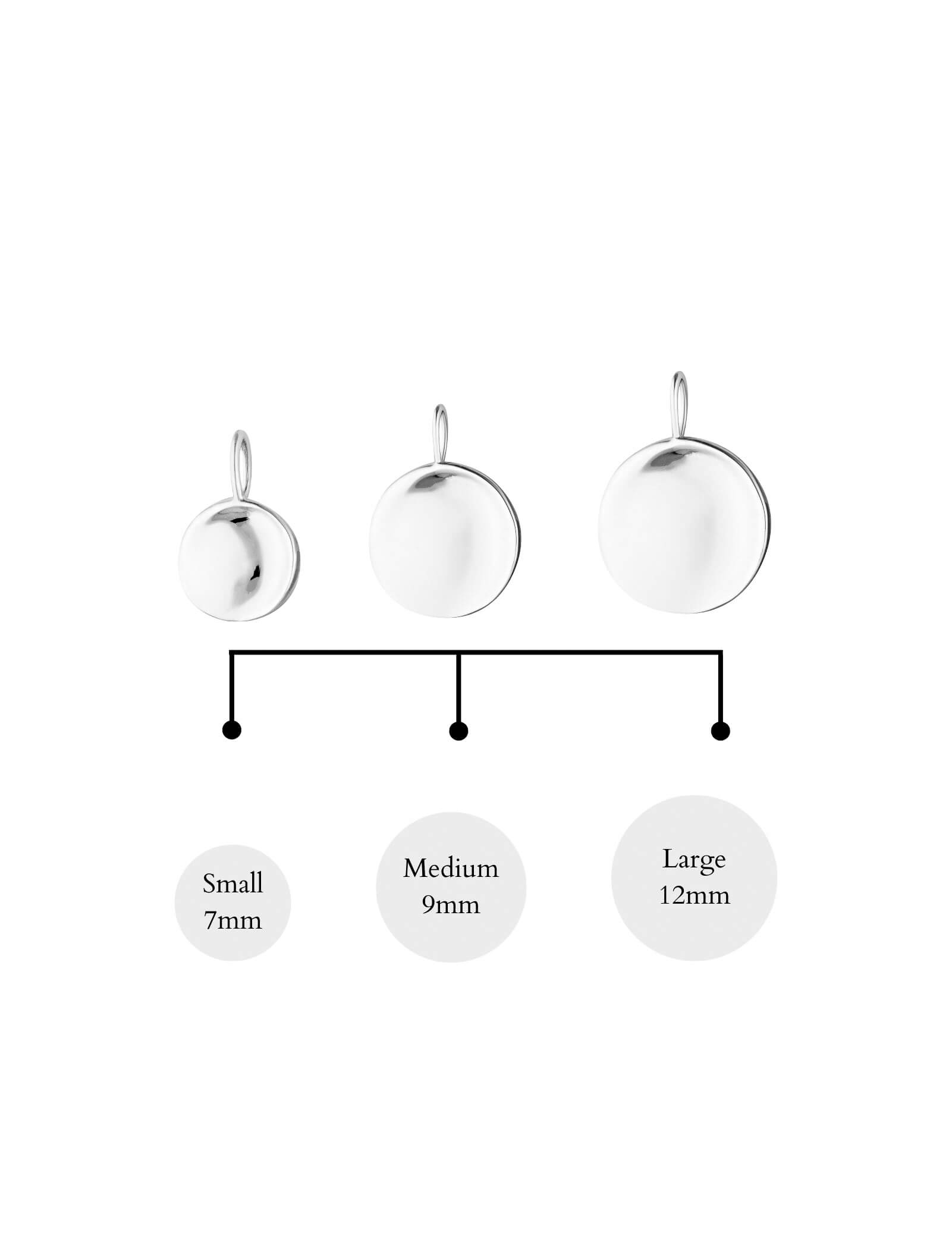 The Waved Disc Pendant comes in three sizes—Small (7 mm diameter, tapered thickness from 1.6 mm to 1.2 mm, 4.7 mm bail), Medium (9 mm diameter, tapered thickness from 1.7 mm to 1.2 mm, 4.7 mm bail) and Large (12 mm diameter, tapered thickness from 1.7 mm to 1.2 mm, 4.7 mm bail). Each piece is lightweight and perfect for stacking, engraving, or wearing solo as a timeless, organic accent.