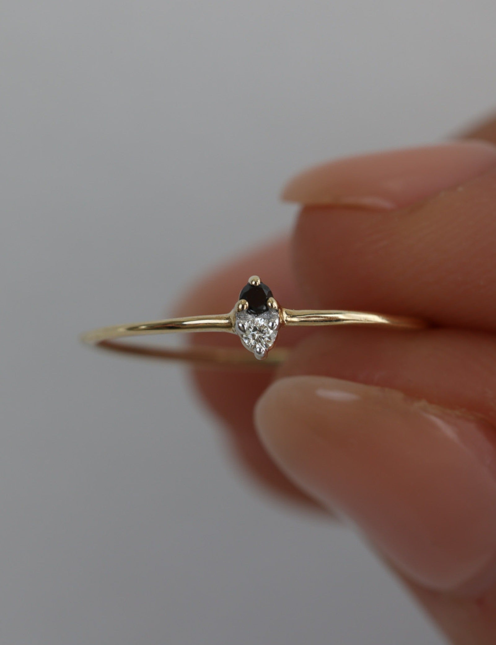 The Solar Ring is a unique design inspired by the harmonious blend of night and day. This exquisite ring features a perfect white diamond and a rare black diamond, beautifully nestled in Solid 9K Gold.