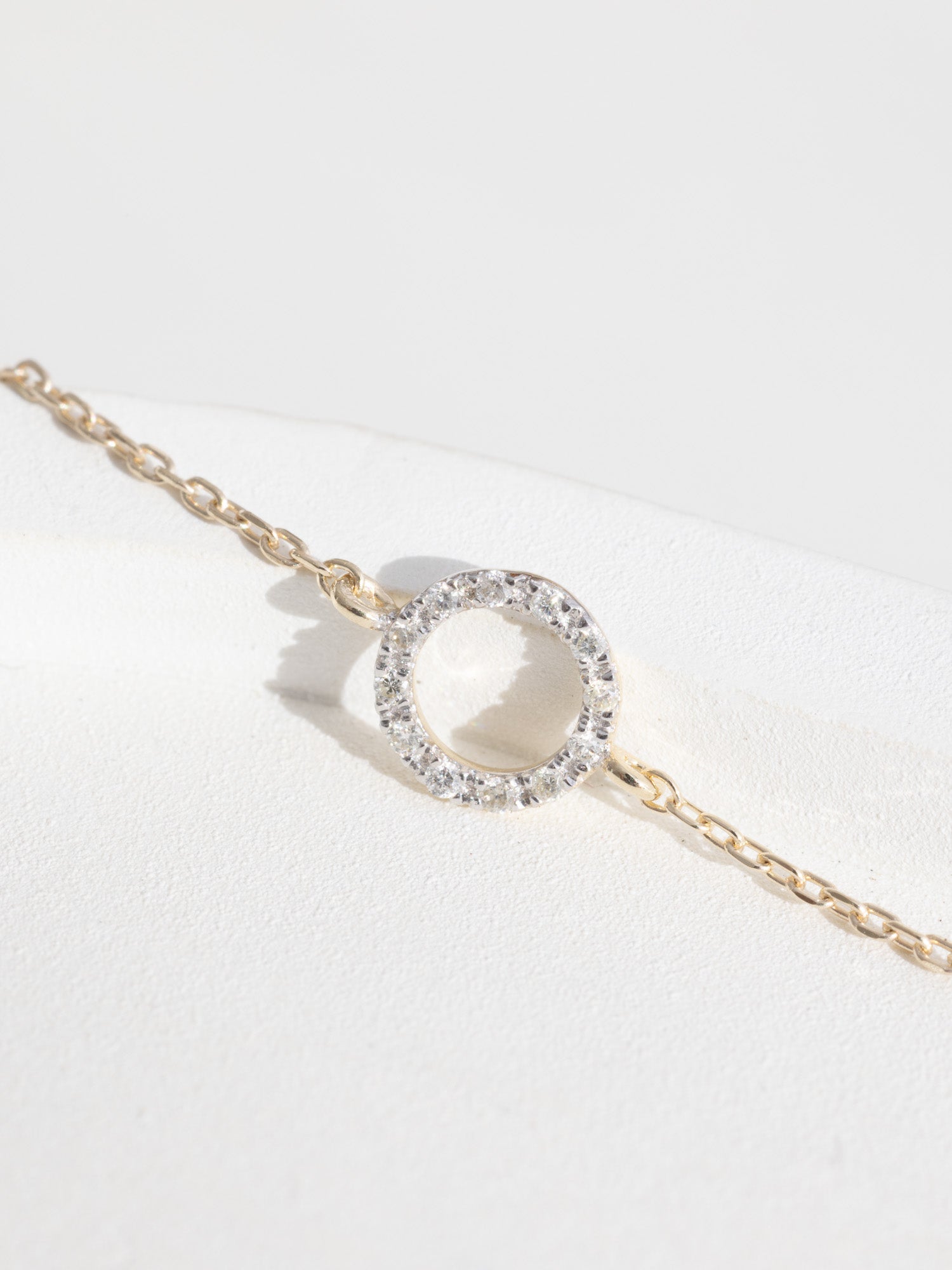 Crafted meticulously from solid 9K gold, the bracelet features a circle adorned with 12 brilliant-cut white diamonds, each marking a celestial connection. Whether worn as a standalone piece or complemented with other jewellery, this bracelet signifies balance, connection, and the spirit's timeless essence.