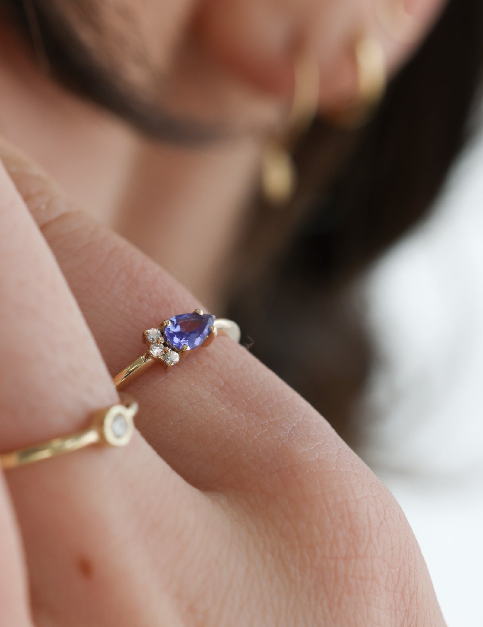 The Tanzanite Dream Ring features a band width of 1.20mm and a thickness of 1.10mm, adorned with three 1.20mm round white diamonds (F/C, I1-I2, I color).The stunning 5x3 mm AAA-grade pear-cut Tanzanite at the center has an average weight of 0.024ct. Crafted from solid 9k gold, the ring offers a perfect blend of elegance and brilliance, weighing approximately 0.98 grams.