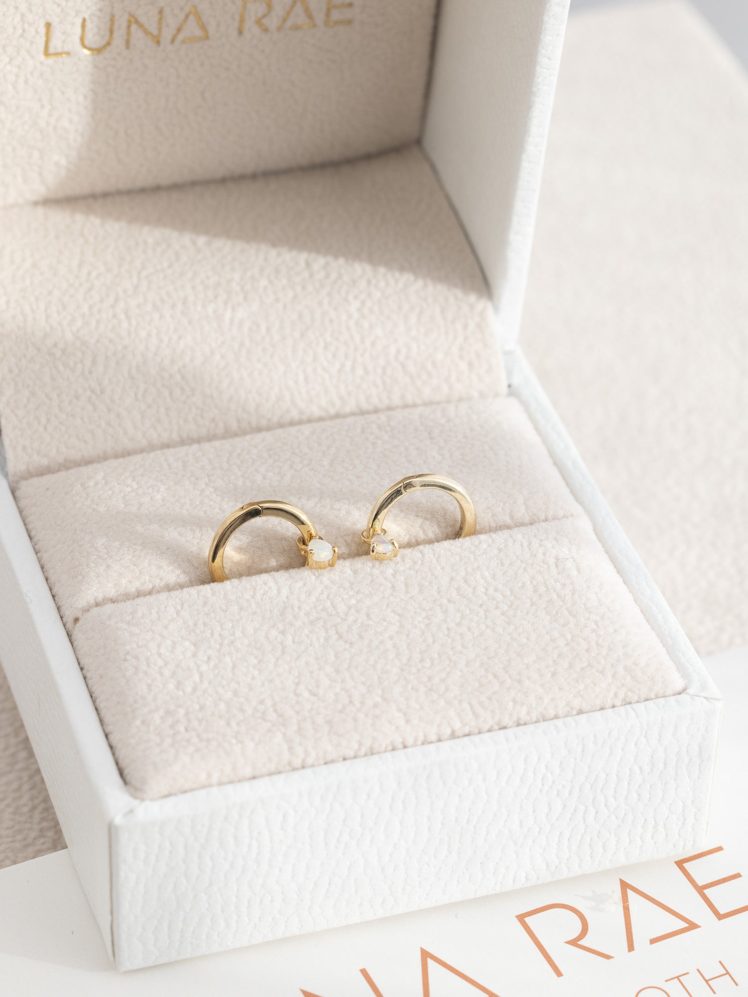 The Venus Earrings are an embodiment of love, beauty, passion, and touch, a perfect symbol of your relationships and a balancing element for work, love, and friendships. Featuring delicate Australian Opals that hang on solid 9K gold huggies, these earrings have an open claw setting that allows light to shine into the opal, enhancing its beauty.
