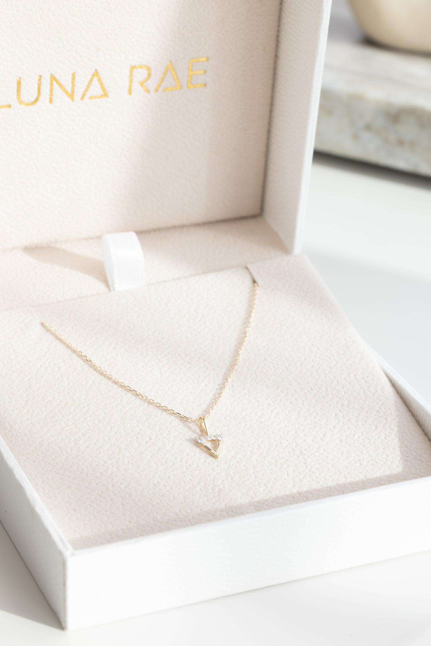 Crafted from solid 9K gold, this necklace features a unique water triangle pendant that points downwards towards the ocean, dotted with a line of brilliant-cut white diamonds that mimic the shimmering surface of water. The Water Element Necklace offers versatile options to suit your style preferences.