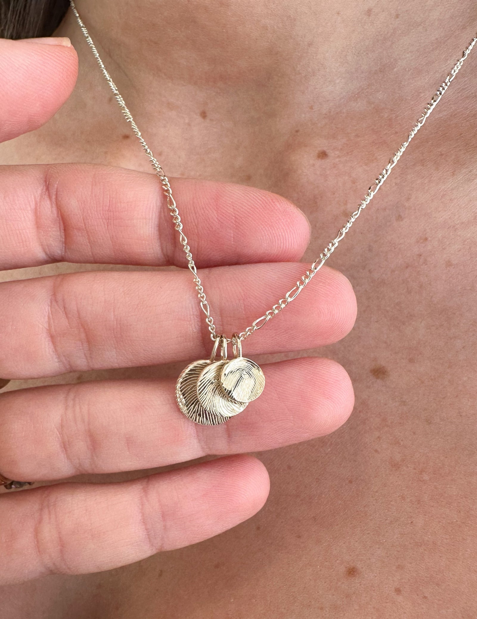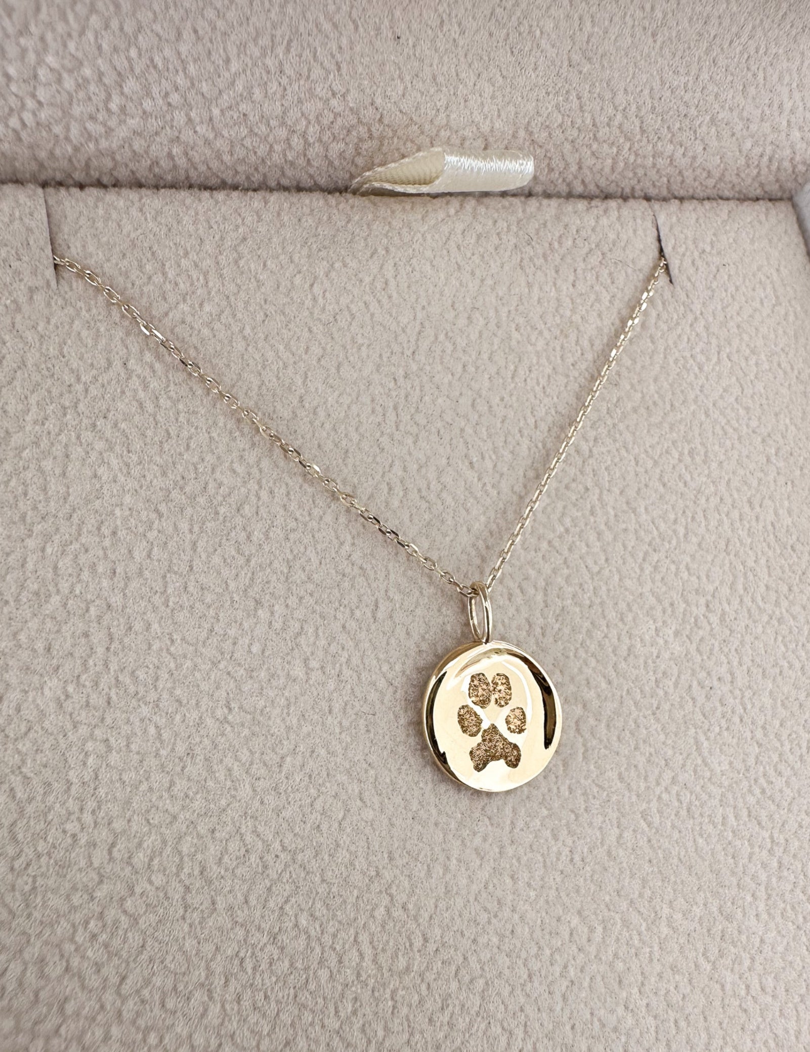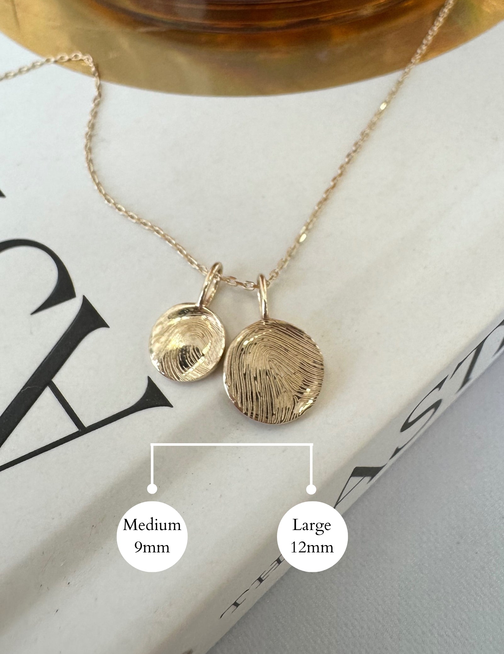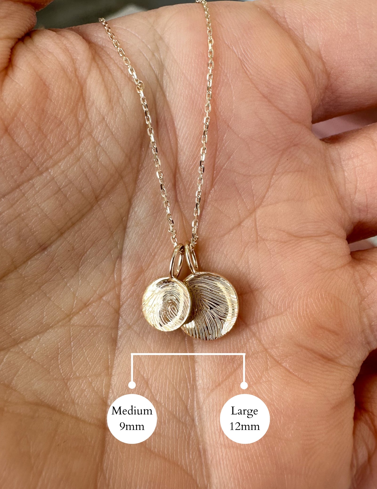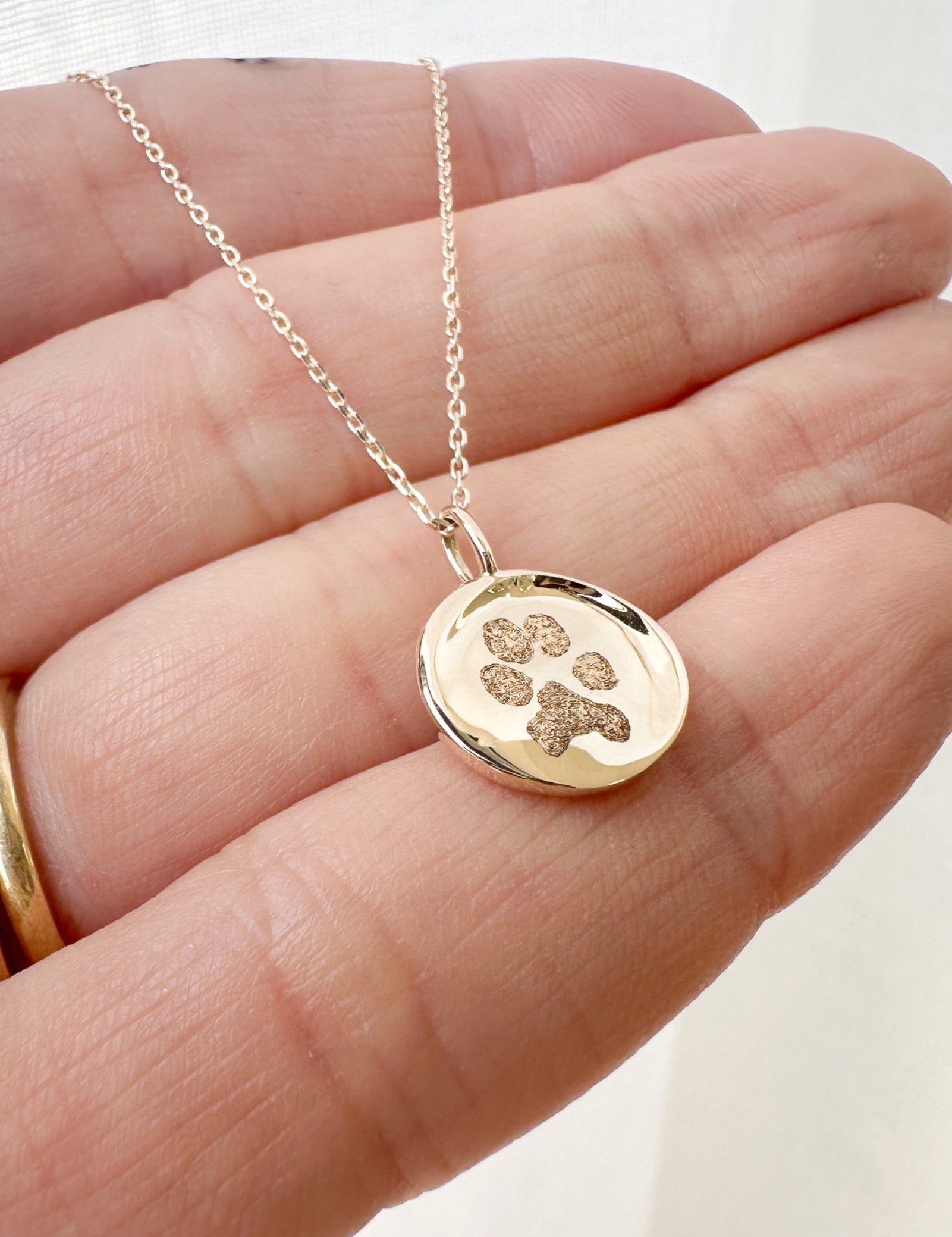 Crafted in solid 9K gold, the Waved Disc Pendant is designed to carry a one-of-a-kind touch — a fingerprint, paw print, special drawing or memorial detail, engraved forever into its soft, organic shape.