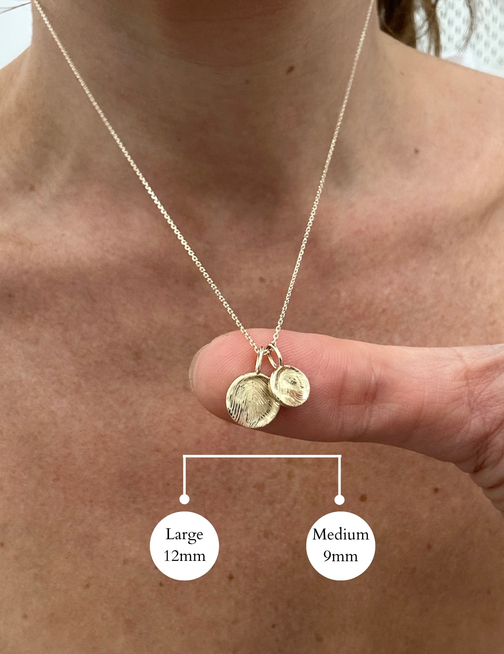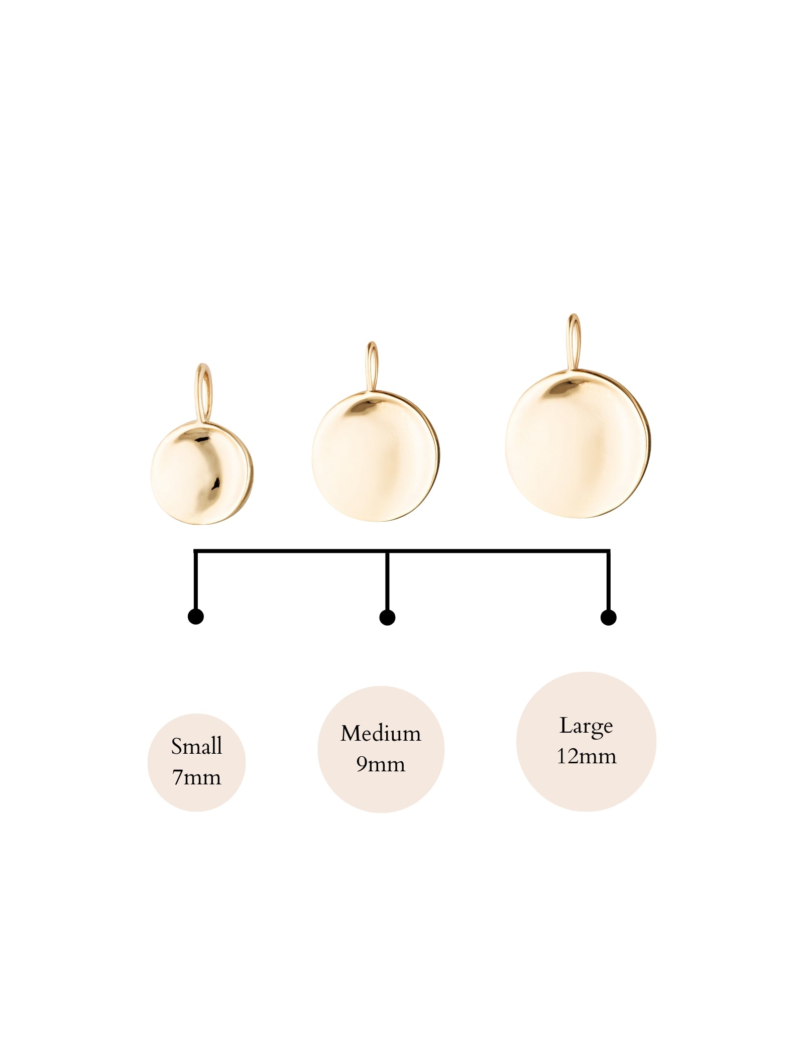 The Waved Disc Pendant comes in three sizes—Small (7 mm diameter, tapered thickness from 1.6 mm to 1.2 mm, 4.7 mm bail, 0.62 g), Medium (9 mm diameter, tapered thickness from 1.7 mm to 1.2 mm, 4.7 mm bail, 0.78 g), and Large (12 mm diameter, tapered thickness from 1.7 mm to 1.2 mm, 4.7 mm bail, 1.35 g). Each piece is lightweight and perfect for stacking, engraving, or wearing solo as a timeless, organic accent.