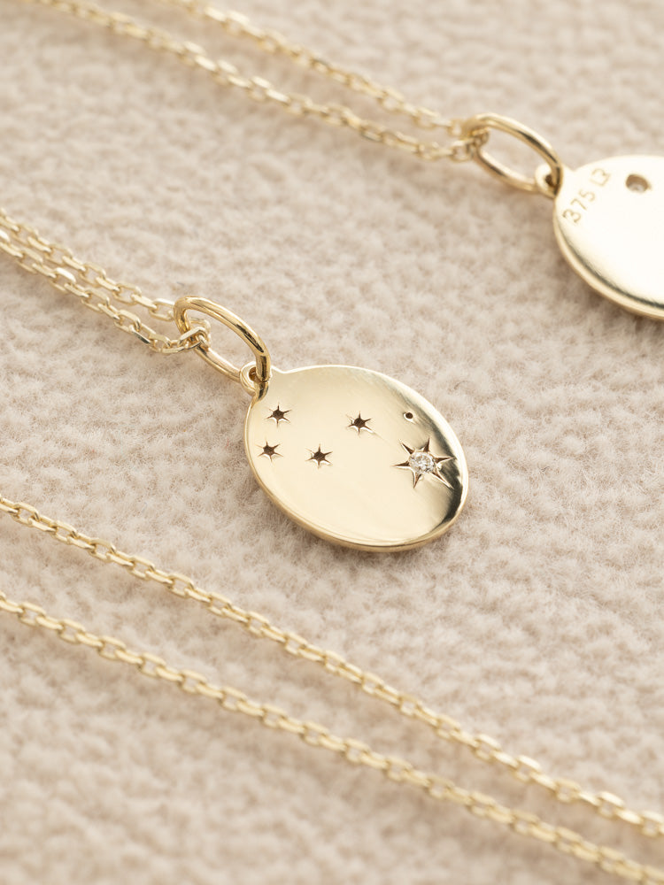 Available as a charm only or paired with either a 50cm or 45cm solid gold chain, this necklace is adaptable, meaningful, and personal to your astrological sign